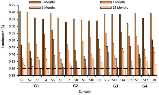 28], being that some testing samples slightly under this value in at 18 months age, as in S12 and S17, but could be still acceptable. That is why we consider that the luminance factor β is not the main limiting factor for durability.