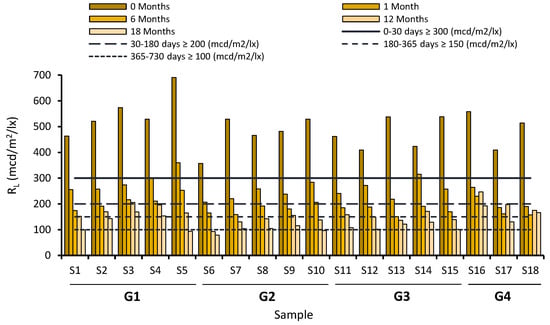 Figure 7. An analysis of the collected data shows that between the sample groups with AS1 application system (monolayer), the best performance is obtained by the group G1 samples, that only use glass microbeads as drop-on material, followed by group G3, whose samples contain glass microbeads (80%) and glass 600 (20%), and the last one is G2, that has a mixture of glass beads and non-transparent antiskid aggregates as drop-on materials. We should underline that group G4 (bilayer) results follow a similar trend, but getting better outcomes than the equivalent AS1 group with the same kind of drop-on aggregates.