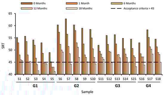 2/lx). For G3, testing samples S13 and S14 are those whose perform best along the different tests, achieving the best results during service life.