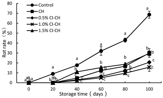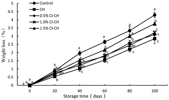 During storage at room temperature, the weight loss rate of each sample gradually increased and reached the maximum at 100 days of storage (Figure 1). This could be due to a water vapor pressure gradient in different compartments of the fruit cell tissue, through which moisture was transferred from the fruit into the immediate environment [32]. Compared with the controls, the weight loss rate of the coated samples slowed down at the late storage stage. At 100 days of storage, the weight loss rate of the coated samples was significantly lower than that of the control fruit (p < 0.05), and they exhibited weight reductions of up to 12.46–33.71%. These results are in agreement with previous studies, which reported that weight loss in navel orange coated with 1.5% chitosan was only 46.52% of the control [33]. This behavior can be explained by the fact that chitosan forms a film on the surface of the fruit, which hinders the exchange of water vapor, thereby reducing water loss through transpiration [34].