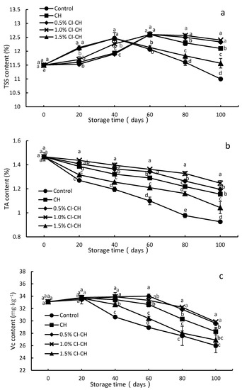 The Vc content of Ponkan fruit gradually increased in the early storage period, and decreased in the middle and late storage periods (Figure 3c). Each coating treatment delayed the degradation of Vc content of the fruit. On the 100th day of storage, the Vc content of the control group was 26.01 mg·kg−1, and of the fruit treated with CH and 0.5%, 1.0%, and 1.5% CI–CH was 8.66%, 13.85%, 14.72%, and 3.46%, respectively, higher than that of the control. Except for 1.5% CI–CH, the Vc content of other coated fruits was significantly higher than that of the control (p < 0.05), which was consistent with the changes observed in navel orange [33].