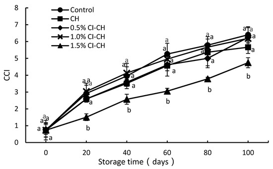 Ponkan is a late-ripening citrus variety. Its peel coloration time is late and the degree of coloration is relatively weak. In order to avoid low-temperature damage, the fruits were harvested when the pulp had reached maturity and the skin was not partially colored [29]. When storage began, the fruit’s CCI value was lower than 1 (Figure 4). With longer storage time, the color of the peel turned from green to pale yellow, and the CCI values gradually increased. This is due to the decrease in chlorophyll content in the citrus peel and the increase in carotenoid content during storage at room temperature [43]. There was no significant difference between the color difference of the control fruit and CH and 0.5% or 1.0% CI–CH fruit. However, the CCI value of the 1.5% CI–CH fruit was significantly lower than that of the control during storage (p < 0.05). This indicated that the chitosan coating and the low concentration of cinnamaldehyde in the coating did not affect the color change of the citrus peel after harvest. However, a high concentration of cinnamaldehyde–chitosan coating (1.5% CI–CH) did affect the normal color change of the citrus peel, and made the CCI value of 1.5% CI–CH fruit significantly lower than that of the control at the end of storage (p < 0.05). This may be due to the phytotoxic effect of an excessive concentration of cinnamaldehyde in 1.5% CI–CH [44].