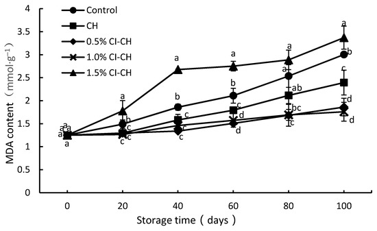 During storage at room temperature, the MDA content of Ponkan fruit gradually increased (Figure 5). This was because the fruit gradually aged as the storage time went on, and the degree of membrane lipid oxidation of the fruit increased. The MDA contents of CH, 0.5% CI–CH, and 1.0% CI–CH were significantly lower than that of the control fruit (p < 0.05). On day 100 of storage, the MDA contents of CH and 0.5% and 1.0% CI–CH fruits were 79.71%, 62.00%, and 58.60%, respectively, of that of the control fruits (3.00 mmol·g–1). This was because the chitosan and low-concentration cinnamaldehyde coating delayed the senescence of Ponkan fruit during postharvest storage, reduced membrane lipid peroxidation, and hence reduced the MDA content. Hong and colleagues [39] also showed that treatment with 2.0% chitosan coating delayed the changes of MDA content in Pearl guava fruit during cold storage and induced a significant increase in resistant enzyme activity. However, the MDA content of 1.5% CI–CH fruits increased sharply in the early storage period, and was significantly higher than that of other treated fruits in the late storage period (Figure 5). This could be due to the higher concentration of cinnamaldehyde in the coating treatment, which can damage the epidermal cells of the fruit, increase the permeability of the cell membranes, and rapidly accumulate MDA content [45].