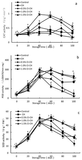 The change of CAT activity of Ponkan fruits during storage at room temperature was determined (Figure 6a), and the activity of the control fruit, which decreased slowly in the early storage period and reached the maximum (37.6%) at 60 days of storage, was higher than the initial value (0.27 U/g min). Compared with the control fruit, the CAT activity of CH-treated fruits decreased significantly in the late storage period and was significantly higher than its counterpart control at 100 days of storage (p < 0.05). This was similar in the case of the study of the effect of calcium chloride, chitosan, and pullulan coatings on the antioxidant activity of Huangguan pears during storage. Chitosan coating treatment slowed the accumulation of total phenolic and flavonoid content, chlorogenic acid, arbutin, catechin, and caffeic acid, and reduced SOD and CAT activity as well as total antioxidant activity in pear fruits during storage [46]. The CAT activity in 0.5% and 1.0% CI–CH fruit significantly increased in the early storage period, and remained at a higher level during subsequent storage. The CAT activity of 0.5% and 1.0% CI–CH was significantly higher compared to that of the control and CH fruits at the end of storage (p < 0.05). This was due to the low concentration of cinnamaldehyde, which increased the antioxidant enzyme activity in the fruits during storage [15].