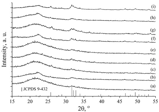 Formation of HA with higher crystallinity of Sample (i) at 30 °C could be explained by the increase of deposition time to 1.5 h. Peak intensities of HA are very low due to thin apatite coating layer on the Mg alloy. The existence of amorphous halo at ~22° 2θ can be explained by the small amount of the samples, which could not cover the significant amount of the cuvette surface used as a sample holder in the X-ray diffractometer.