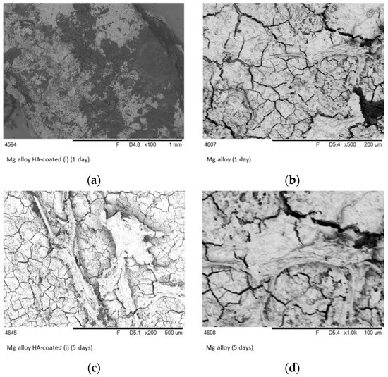 SEM images of the surface of HA–Mg coatings (a,c) and Mg-alloys (b,d) after one and 5 days of implantation in bone tissue.