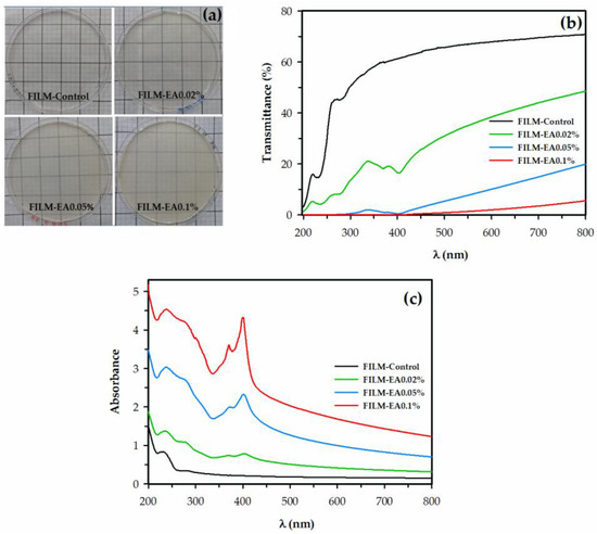 Figure 2. (a) Digital images, (b) UV-vis transmittance and (c) UV-vis absorbance spectra of apple starch films without ellagic acid (FILM-Control) and with ellagic acid (EA) added to 0.02% (FILM-EA0.02%), 0.05% (FILM-EA0.05%) and 0.1% (FILM-EA0.1%).