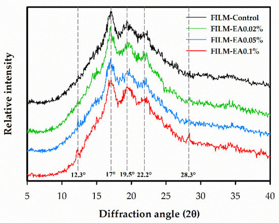 Figure 3. X-ray diffractograms of apple starch films without ellagic acid (FILM-Control) and with ellagic acid (EA) added to 0.02% (FILM-EA0.02%), 0.05% (FILM-EA0.05%) and 0.1% (FILM-EA0.1%).