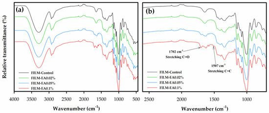 Figure 4. Fourier transform infrared (FTIR) spectra evaluated in: (a) 4000–650 cm−1 and (b) 2600–700 cm−1 of apple starch films without ellagic acid (FILM-Control) and with ellagic acid (EA) added to 0.02% (FILM-EA0.02%), 0.05% (FILM-EA0.05%) and 0.1% (FILM-EA0.1%).