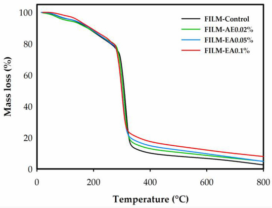Figure 5. Thermogravimetric curves of apple starch films without ellagic acid (FILM-Control) and with ellagic acid (EA) added to 0.02% (FILM-EA0.02%), 0.05% (FILM-EA0.05%) and 0.1% (FILM-EA0.1%).