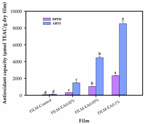 Figure 6. Antioxidant capacity (evaluated by DPPH and ABTS techniques) of apple starch films without ellagic acid (FILM-Control) and with ellagic acid (EA) added to 0.02% (FILM-EA0.02%), 0.05% (FILM-EA0.05%) and 0.1% (FILM-EA0.1%).