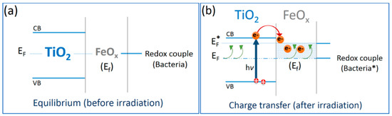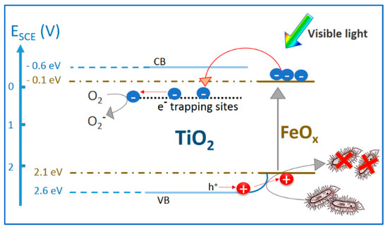 The mechanism of the reaction between TiO2–FeOx–PE and the bacteria under visible light proceeded noted in Equation (1). Under visible light, FeOx (mainly Fe2O3), as it will be described in the paragraph below, would transfer the photo-generated electrons in the conduction band (cbe−) to the lower-lying TiO2 sites, since FeOx presents a conduction band (cb) positioned at potential energy values 0.4–0.6 eV, below the anatase trapping states [30]. Leytner et al. [31] identified the electron-trapping sites in anatase positioned at ~0.8 eV below the anatase (cb) by time-resolved photo-acoustic spectroscopy (TRPAS). Gray et al. [32] used electron paramagnetic resonance (EPR) spectroscopy and reported anatase trapping sites located ~0.5–0.8 eV below the anatase (cb). The mechanism for the interfacial charge transfer (IFCT) between Fe2O3 and TiO2 on sol–gel films is suggested in Figure 2.