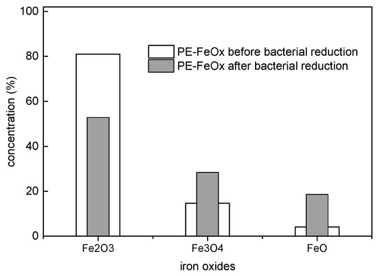 It is interesting, at this point, to look into the oxidation states of the FeOx species before and after bacterial inactivation. Figure 3 presents the changes in the Fe oxidation states of PE–FeOx within the 120 min bacterial inactivation reported in Figure 1, trace (1). Figure 3 shows that the initial Fe(III)/Fe2O3 at 712.2 eV decreased from ~80.0% at time zero to ~53.0% after bacterial inactivation. Concomitantly, an increase in the Fe3O4 at 713.6 eV and Fe(II) at 709.7 eV was observed. The X-ray photoelectron spectroscopy (XPS) shifts were referenced by the values found in reference [33]. Therefore, during the bacterial inactivation period, redox reactions occurred on the catalyst surface during bacterial inactivation. After bacterial inactivation, the XPS peak positions for Fe(III), FeO(II/III), and Fe(II) peaks were: 711.4, 708.6, and 713.8 eV, respectively [34]. The three Fe-oxides in Figure 3 intervened with a different potential during bacterial reduction as shown in Figure 3. The surface concentration of the elements were observed to remain fairly stable within the period of bacterial inactivation (see Table 1).