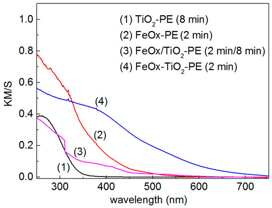 Diffuse reflection spectroscopy (DRS) showing the Fe(III) shifting band gap excitation of TiO2 to the visible region in the samples: (1) TiO2–PE (8 min), (2) FeOx–PE (2 min), (3) sequentially sputtered TiO2/FeOx–PE (2 min FeOx, 8 min TiO2), and (4) co-sputtered TiO2—FeOx–PE (2 min). Reprinted with permission from [39]. Copyright 2015 RSC.