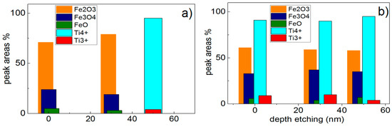 Figure 7a presents the XPS for the sequentially sputtered films. Figure 7a shows the atomic percentage composition as a function of the etching depth for Fe, Ti, and O. The etching of the film surface was carried out by sputtering Ar ions of 5 kV. These Ar ions are able to reach a depth of ~50 nm (~250 layers). The TiO2 under-layers in Figure 7 were only detected up to 30 nm and reached an atomic concentration of 60% after sputtering Ar ions for 45 nm. The O-enrichment level was stable at 25%–30% up to 65 nm. Figure 7b shows that the surface atomic percentage of the Ti and Fe layers was similar within 50 nm (250 atomic layers). The amount of O in the surface was close to those of TiO2 and FeOx at ~30%. Figure 7a,b show the drastic differences in the microstructure of the TiO2–FeOx films for the sequential and co-sputtered samples.