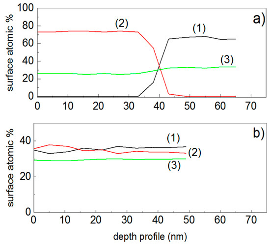 XPS etching by way of a beam of 5 kV Ar ion for: (a) sequentially sputtered TiO2/FeOx-PE films, (1) Ti2p, (2) Fe2p, and (3) O1s; (b) Co-sputtered TiO2–FeOx–PE films showing the atomic percentage concentration of atoms, (1) Ti2p, (2) Fe2p, and (3) O1s in the topmost layers (2 nm) as a function of the penetration depth. Reprinted from [54].