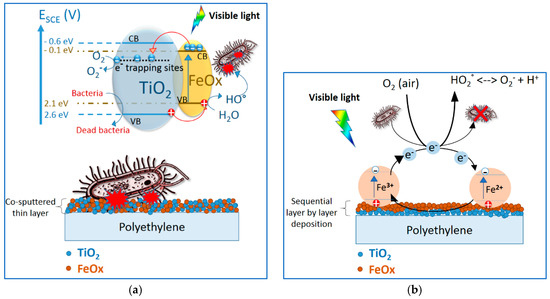 The schematic intervention of co-sputtered FeOx–TiO2 leading to bacterial inactivation is suggested in Figure 8a. The mixed TiO2–FeOx–PE film led to charge separation and involved quasi-Fermi equilibration between the two oxides. The FeOx electron transfer to low-lying TiO2 trapping states is shown in Figure 8a. The co-sputtered TiO2–FeOx–PE films induced a faster bacterial inactivation compared to the sequentially sputtered TiO2/FeOx–PE. A decrease in the film FeOx electron-hole recombination rate occurred in the co-sputtered TiO2-FeOx films. Some steps involving the transfer of Fe2O3 cb (e−) into the TiO2 trapping sites are noted below: