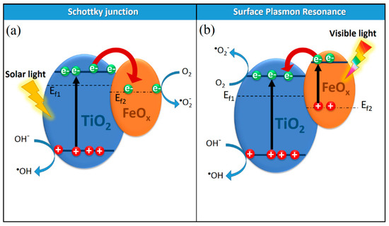 In the sequentially sputtered TiO2/FeOx–PE film as shown in Figure 8b, the FeOx topmost layers absorbed the visible light reaching the sample surface [36,39,54]. The incorporation of Fe oxides into the crystal lattice of wide band-gap semiconductors (such as TiO2) improved the photocatalytic activity of TiO2 in the visible-light region because of the surface plasmon resonance (SPR) effect of FeOx [55,56]. The surface plasmon resonance arises from the collective oscillations of electrons on the surfaces of metals and oxides, and these surface transfer electrons into the conduction band of TiO2 because of the Schottky barrier. The Schottky barrier between FeOx and TiO2 arises as a consequence of the Fermi level equilibration between TiO2 and FeOx. This favors the separation of the photo-generated charges, as noted in Figure 9 [57,58].