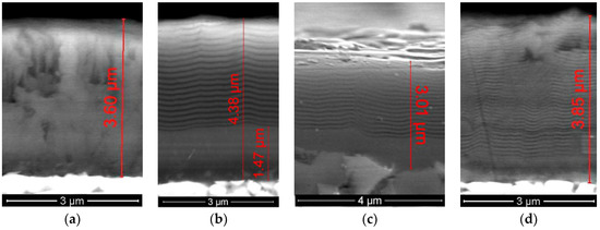 The conducted microstructure studies of the specified coatings (Figure 3) detected the typical columnar structure in the TiN coating. The Ti–TiN–(Ti,Al)N, Zr–ZrN–(Zr,Al)N, and Zr–ZrN–(Zr,Cr,Al)N coatings have nano-structured wear-resistant layers with average thicknesses of the binary nanolayer of λ = 150, 120, and 80 nm, respectively. The total thickness of the coatings is identical and is equal to about 3.5 µm (taking into account the uniformity of the coating thickness).