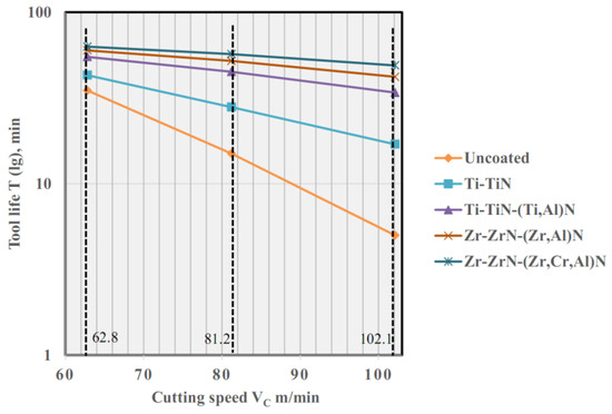 The results of the cutting tests at the cutting speeds of 62.8 m/min, 81.2 m/min and 102.1 m/min are presented in Figure 5.