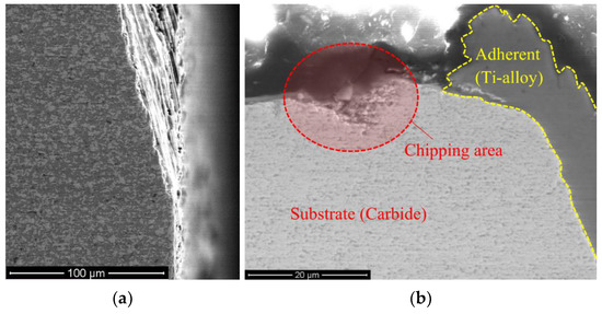 The wear mechanism of the Zr–ZrN–(Zr,Al)N coating has a number of specific features compared to the above (Figure 12). It can be argued that this coating is more plastic, and it is better retained on the rake face of the tool. Given that the adhesive processes continue to play a certain role in the wear of the tool with the coating under study, it can be argued about a decrease in their influence. In particular, despite the formation of delaminations in the coating structure, this does not lead to its significant or complete failure (Figure 12c,d). In some cases, fragments of the coating are torn off, but the process is much more localized (Figure 12b). During consideration of the area immediately adjacent to the cutting edge (Figure 12a), it is possible to notice signs of abrasive wear in the carbide structure. Meanwhile, the wear process is much more balanced, without noticeable brittle fracture and spallation from the substrate.