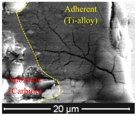 Let us consider in more detail the wear processes for each of the tools under study. For the uncoated tool, the active abrasive wear and chipping on the flank face are typical (Figure 8a), as well as plastic deformations and chipping on the flank face (Figure 8b). There is a system of branching cracks in the structure of the adherent of the material being machined on the flank face (Figure 9), and this may indicate the presence in the area of cyclic thermal stresses and the high temperature close to the melting point of titanium (1670 °C).