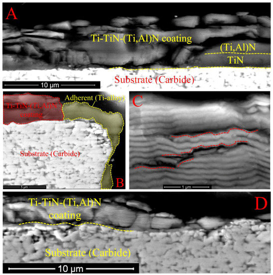 - Vereschaka, A.A.; Grigoriev, S.N.; Sitnikov, N.N.; Batako, A. Delamination and longitudinal cracking in multi-layered composite nano-structured coatings and their influence on cutting tool life. Wear 2017, 390–391, 209–219. [Google Scholar] [CrossRef]