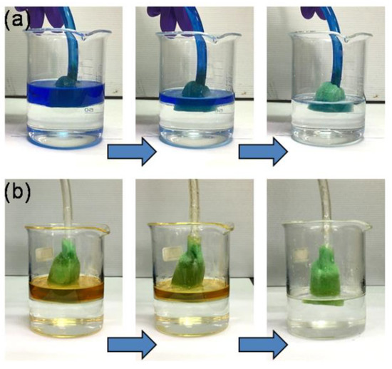 In previous studies of superhydrophobic porous materials, the absorbed oil was typically removed using a squeezing operation, distillation, or a solvent washing method, all of which would have to be rehashed on incalculable occasions in a practical oil slick cleanup; the method can be to a great degree monotonous and not vitality productive. As of late, we demonstrated that pumping through superhydrophobic porous materials could be used to realize the continuous absorption and removal of organic pollutants from water surfaces, greatly decreasing the consumption of materials and simplifying the oil recovery process [24]. Because of their superhydrophobicity and superoleophilicity, our superhydrophobic PU sponges (SHPUS) could be used for the continuous removal of oil pollutants. We connected a SHPUS to a tube and placed it at the oil-water interface in a mixture of oil and water. As indicated in Figure 3a, the SHPUS quickly became saturated with the oil (isooctane) while completely repelling the water. Subsequently, we employed a vacuum system (0.5 bar) to remove the oil from the water surface in a continuous manner. The oil floating on the water surface was removed continuously through the sorbent until all of the oil disappeared. In addition, no water droplets were visible to the naked eye in the collected filtrate oil (Figure S2). We also performed these continuous oil/water separation experiments with viscous motor oil/water mixtures (Figure 3b) and other oil/water mixtures; all mixtures were completely separated.