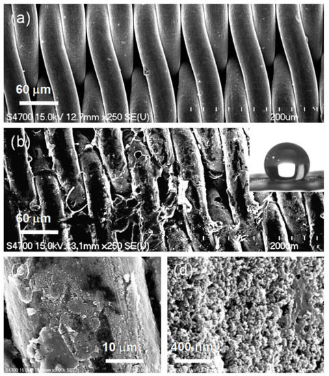 SEM images of (a) unmodified and (b) rough hydrophobic polymer-coated stainless-steel mesh; inset: photograph of water droplet on the mesh; (c) Enlarged view of a microstructure in (b); (d) Enlarged view of (c).
