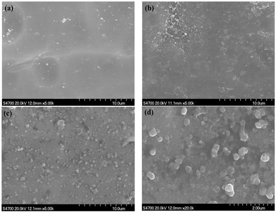 A compact yellow conversion coating was prepared on the 5052 aluminum alloys after the conversion treatment. Figure 1 shows the surface morphologies of the coating. A continuous, compact and well-covered coating can be seen by comparing Figure 1a,b. The obtained coatings are smooth; however, they became coarse after FAS-17 modification treatment as seen in Figure 1c,d. Some micro-protrudes were generated on the coating surface [19]. These micro-protrudes may increase the roughness of the surface and decrease the surface energy, which improves the hydrophobic properties of the coating. All of these characteristics may be related to the antifouling performance of the coating.