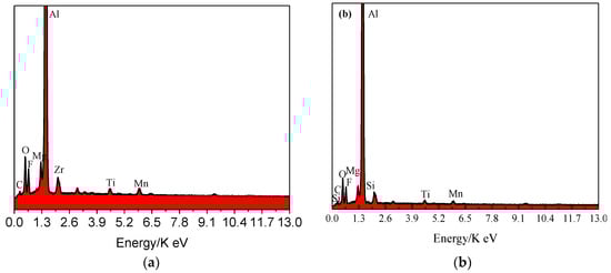 Figure 2 shows the EDS spectra of the coating. The conversion coating contains Al, O, F, Mg, Zr, Ti and Mn as shown in Figure 2a. The concentration of Al, Ti and Mn is relatively high, and they may exist in oxide or fluoride states. The concentration of Zr is relatively low, and it is usually covered by other elements [20,21]. After the FAS-17 post treatment, C and Si elements emerged (Figure 2b). As is well known, the FAS-17 contains C–F and Si–O atom groups, and the spectrum indicated that a fluorosilane film was produced on the surface of the conversion coating after FAS-17 modification.