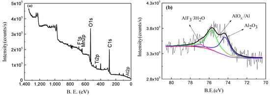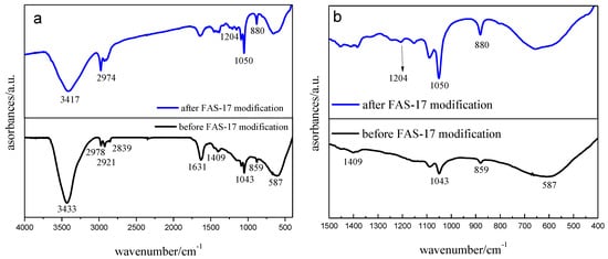 FT–IR was utilized to analyze the compositions of the coating. Figure 3 shows the FT–IR spectra of the conversion before and after FAS-17 modification. As shown in Figure 3a, the absorption around 3433 cm−1 is assigned to the absorptions of a hydroxyl group. The characteristic peaks at the range of 2839–2978 cm−1 are assigned to the absorptions of C–H [16,22]. The characteristic peak at around 1631 cm−1 is assigned to the absorptions of Al–O. The characteristic peak at 1409 cm−1 is assigned to the absorptions of Mn–O. The characteristic peak at 1043 cm−1 is assigned to the absorptions of S=O in surfactant. The characteristic peak at 859 cm−1 is assigned to the absorptions of Ti–O and the characteristic peak at 587 cm−1 is assigned to the absorptions of Al–F [23]. A thin fluorosilane film was adhered to the conversion coating by FAS-17 modification. The spectrum shows some new characteristic peaks located in the range of 1050–1205 cm−1 and 1383–1454 cm−1. The characteristic peaks at the range of 1050–1205 cm−1 are assigned to the absorptions of C–F in CF3 and CF2 [24]. The characteristic bands at the range of 1383–1454 cm−1 are assigned to the absorptions of CF3 [23,25,26]. The characteristic peak at 1204 cm−1 is assigned to the absorptions of CF2 [25]. The characteristic peaks at 1050 and 880 cm−1 are assigned to the absorptions of Si–O–C and Si–O, respectively [23,24].
