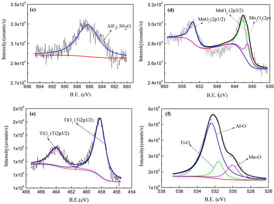 XPS spectra of conversion-coated 5052 aluminum alloy: (a) the wide-scan spectrum, (b) Al2p spectrum, (c) F1s spectrum, (d) Mn2p spectrum, (e) Ti2p spectrum, and (f) O1s spectrum.