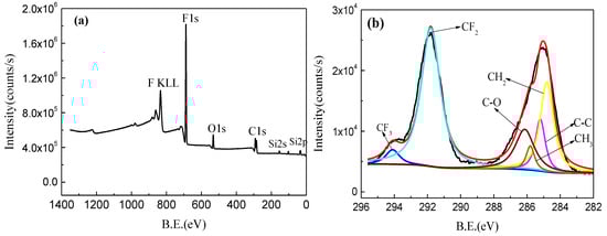 As described previously, thin fluorosilane films were produced onto the surface of the conversion coating after the FAS-17 modification. The elements on the surface may also change after this step. Figure 5 shows the XPS spectra of the conversion coating after FAS-17 modification. As illustrated in Figure 5a, the intensity of the F1s peak increased and the Si2s and Si2p spectra emerged. The C1s spectrum is composed of six fitted peaks with the binding energies at 294.1, 291.8, 286.14, 285.8, 285.2 and 284.8 eV, which are assigned to the CF3, CF2, C–O, CH3, C–C and CH2 groups, respectively [19,28,29].
