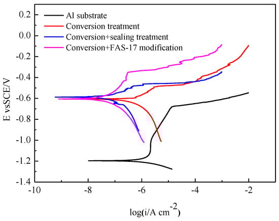 A salt water immersion test was utilized to further analyze corrosion resistance of the conversion coating. The results indicated that the corrosion resistance of aluminum alloy substrate was significantly improved by conversion treatment. The corrosion rate of aluminum alloy substrate in 3.5% NaCl solution dropped from 0.240 g·m−2·h−1 to 0.046 g·m−2·h−1, and it further dropped to 0.0118 g·m−2·h−1 after FAS-17 modification.