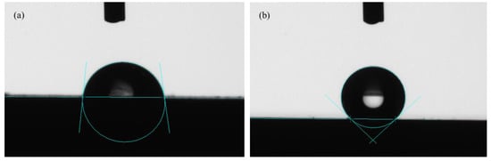 The contact angle of conversion-coated 5052 aluminum alloy: (a) before FAS-17 modification, (b) after FAS-17 modification.
