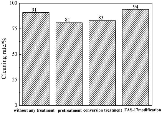 The simulated pollutant test was carried out on the FAS-17-modified coating in order to analyze the antifouling performance. Figure 8 shows the cleaning rate of aluminum alloy samples through different treatments. As shown in Figure 7, the cleaning rate of samples without any treatment, with pretreatment, and with conversion treatment are 91%, 81% and 83%, respectively. Samples have a higher cleaning rate after FAS-17 modification. Taking the corrosion resistance and antifouling performance into account, the latter exhibits better antifouling performance. As is proved previously, a thin fluorosilane film formed on the surface of the conversion coating. Micro-protrudes were generated on the surface and some atom groups such as CF3 and CF2, which can lower the surface energy, were seen; these groups eventually resulted in a hydrophobic surface. The hydrophobic surface improved the antifouling performance of the conversion coating.