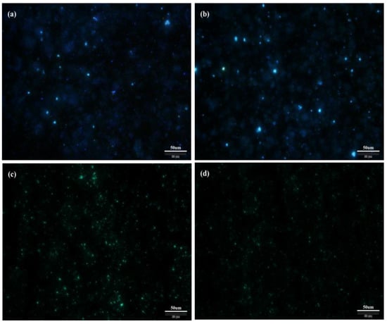 In order to analyze the antifouling performance intuitively, fluorescence microscopy was used to observe the surface of the conversion coating. Figure 9 shows the fluorescence images of conversion coating. Figure 9a,b are the fluorescence images of aluminum alloy samples after conversion treatment and after FAS-17 modification, respectively. It can be seen from the images that no green fluorescence substance can be detected [33], indicating that the fluorescence substance comes from coated pollutant, not the FAS-17. Figure 9c,d are the fluorescence images of coating after pollutant was removed. By comparing the Figure 9c,d, we observe that the samples after FAS-17 modification have less green fluorescence substance and the brightness is relatively small. These results indicate that there is less pollutant left on the surface of the coating after FAS-17 treatment, corresponding to a better antifouling performance.