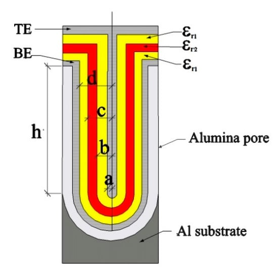 11]. The use of the ALD technique allows one to take advantage of the internal surface inside the NAAM’s pores to deposit the three layers that make up the typical structure of the capacitor, that is, the upper and the lower electrode and, between them, the dielectric material. The goal of ALD employment is to reduce the thickness of the dielectric material (