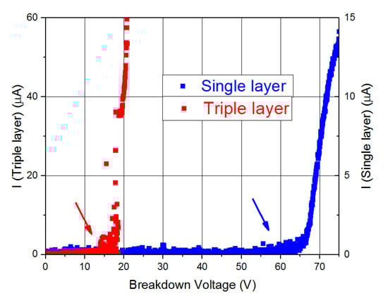 It has been found that the Al2O3 single-dielectric layer capacitors of 9 nm in thickness have been shown to exhibit a better performance than the triple dielectric layer capacitors composed of SiO2/TiO2/SiO2 sheets, each 3 nm in thickness. In particular, single dielectric layer capacitors have less internal resistance (2.3 kΩ), so they are more favorable for storage applications because of a consequent lower power consumption. Al2O3 single-layered capacitors also offer a higher capacitance in dynamic regime (41.6 nF) than those of triple-layered SiO2/TiO2/SiO2. Furthermore, the former display leakage current is lower than 50 nA, so it guarantees that the current losses will be minimal. The main advantage shown by these capacitors is the high value of breakdown voltage (63 V), as a higher working voltage greatly improves the storage capacity of electrical energy of these devices. Only the static regime of capacitance for triple dielectric layer capacitors (93 nF) is higher than that of the single dielectric layer devices (54 nF). However, taking into account all the features in which the Al2O3 capacitors offer better performance, a single property is not enough to affirm that SiO2/TiO2/SiO2 devices have better characteristics.