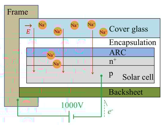 Photovoltaic (PV) has been recognized as the most competitive renewable energy among various renewable technologies according to its diverse applications and is a candidate of next generation large-volume power plants. For instance, Águas et al. [] applied the PV for building-integrated photovoltaics (BIPV) application; Águas et al. [] also fabricated thin film solar cells on cellulose paper for flexible, wearable application; and most of all was for large-scale power plants. According to the statistic reports of International Energy Agency (IEA), it pointed out that the cumulative installed capacity of solar installations was almost 303 GW at the end of 2016 []. Based on the demand for long-term and safe operation, the reliabilities of PV modules gain more attention. In Figure 1, we depicted the components of crystalline silicon module under negative bias. Solar cells were held in between the front glass cover and the rear backsheet. The glass was used for light transmission and module protection; the backsheet was implemented for the reflection of incident lights shined at the gap between individual solar cells and for the reflection of residual lights that penetrate the solar cells. In general, the lifetime of PV modules was designed over 25 years. However, several kinds of issues resulted in irreversible degradation of PV modules, in which one of the most catastrophic failures was noted as potential-induced degradation (PID).