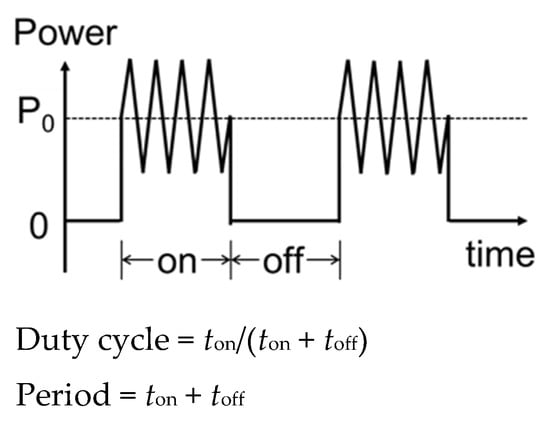 Recently, a novel PECVD method, PP modulated PECVD, is commonly used for modifying SiNx films by controlling the ion bombardment and film nucleation process [,,,]. Contrary to continuous-plasma PECVD, the manipulation of pulsed-plasma PECVD is by using a frequency modulated glow discharge during deposition, and then modifying the film qualities. After ionization, the lifetimes between free radicals remain different, and then the clusters during the film synthesization have been designated by controlling the duty cycle and periods. The duty cycle is the ratio of conducting glow discharge to the periods, as shown in the schematic diagram in Figure 2. In the scenario of low frequency modulated radio frequency (RF) discharge (40 Hz) in Watanabe et al.’s study [], lifetimes of SiHn (n = 0–2) radicals were shorter than 10 ms (these were estimated to be below 3 ms); whereas the lifetime of SiH3 was longer than 20 ms. Regarding the achievement of film quality modification by PP PECVD, Watanabe et al. also pointed out the film mainly composed of SiH3 shows fewer dangling bonds and reduced powder particle in size during deposition []. In addition, Viera et al. reported a high purity and controllable nanostructure achieved by the PP method [], and Byungwhan Kim et al. pointed out that the films made by the PP method present denser and smoother surface roughness [].