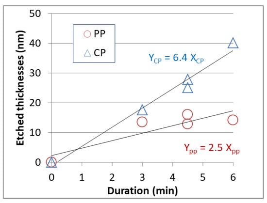 The etched film thickness for different etching duration is presented in Figure 4. The film thicknesses of origin, and after 3, 6, and 9 min etched, were measured by ellipsometer, and the discrepancies were calculated. The HF-etching rates were deduced by linear fitting. The HF-etching rate of SiNx film deposited by PP PECVD is 2.5 nm/min, 2.6 times lower than the one by CP PECVD. Mishina et al. [] pointed out that the mechanism of HF etching is associated with the SiNx dissociations via oxygen assistance, i.e., higher oxygen density in the SiNx film leads to a larger HF-etching rate. In addition, the SiNx film with lower HF etching rate (lower oxygen density) is related to high PID-resistance []. The root cause is that the oxygen contained in SiNx may be in the form of SiN2O or SiO2, and subsequently, the SiO2 dissolved in the molten salt (Na+) will form a liquid sodium silicate (Na2O·(SiO2)) [,,]. The oxygen-assisted corrosion of the SiNx film in molten salt would create a shunting path and then worsens the original PID-resistance of the ARC film. Accordingly, since our ARC films made by the PP method contain less oxygen atoms than by the CP method, we derived the SiNx film bade by the PP method to perform better PID-resistance.