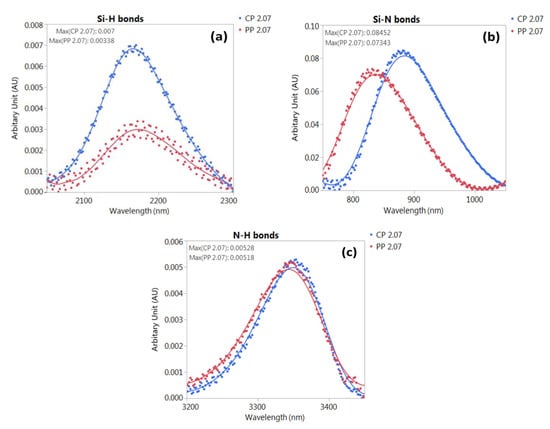 IR absorbance of (a) Si–H, (b) Si–N, and (c) N–H bonds by Fourier transform infrared (FTIR) characterizations for the SiNx films deposited by the CP and PP methods. The smooth curves are provided as a guide to the eye for indicating the absorbance peaks.