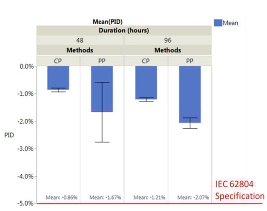 where Pmpp,AF is the maximum output power under standard testing conditions after PID treatment, and Pmpp,BF is the one before PID treatment. Under the IEC 62804 standard, modules with less than 5% power loss and without induced major defects could be recognized as PID resistance [,].