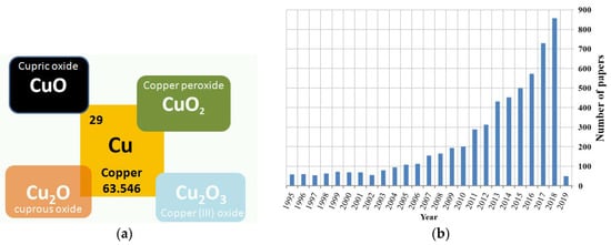 The copper oxides: (a) schematic view of the possible copper oxide forms and (b) the number of papers related to CuO-based gas sensors from 1995–2019.