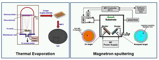 The copper oxide deposition methods: (a) Thermal evaporation (Reprinted with permission from [34]); (b) Magnetron sputtering (Reprinted with permission from [28]. Copyright 2017 Elsevier); (c) Hydrothermal method (Reprinted with permission from [37]. Copyright 2017 Elsevier); (d) Facile method (Reprinted with permission from [53]. Copyright 2018 Elsevier).