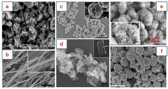 SEM photos of the copper oxides with different morphologies: (a) nanostructures (Reprinted with permission from [27]); (b) nanowires (Reprinted with permission from [16]); (c) nanostructures (Reprinted with permission from [26]); (d) nanobelts (Reprinted with permission from [24]. Copyright 2017 Elsevier); (e) nanostructures (Reprinted with permission from [45]. Copyright 2016 Elsevier); (f) hollow spheres (Reprinted with permission from [23]. Copyright 2017 Elsevier).
