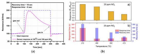 The copper oxides under exposure to nitrogen dioxide: (a) resistance change of the amorphous CuO thin film under exposure to 100 ppm of NO2 at 180 °C and 50% RH (Reprinted with permission from [32]. Copyright 2014 IEEE); (b) responses and response/recovery time (s) of nanocrystalline CuO thin films under exposure to 20 ppm NO2 at various temperatures and 50% RH. (Reprinted with permission from [70]. Copyright 2018 IEEE).