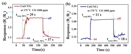The response and recovery times of the (a) CuO NTs and (b) CuO NCs exposed to 1000 ppm Reprinted with permission from [54]. Copyright 2018 Elsevier.